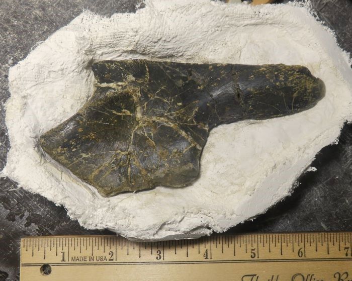 I was a volunteer at The Field Museum and, since 2001, have been a volunteer in Paleontology Department and then the Dino Lab at the “Dinosaur Institute” of the Natural History Museum of Los Angeles County, where I get to work first-hand preparing real fossil dinosaur bones, like the Apatosaurus femur shown below, and also remains of other Mesozoic animals. like the phytosaur ilium in the next photo.