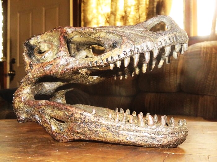 Metal miniature reproductions of a skull of the carnivorous dinosaur Velociraptor skull, and skeletons of the plated dinosaur Stegosaurus. the pterosaur Anhanguerathe and the sail-back pelycosaur Dimetrodon skeleton and , made in China.