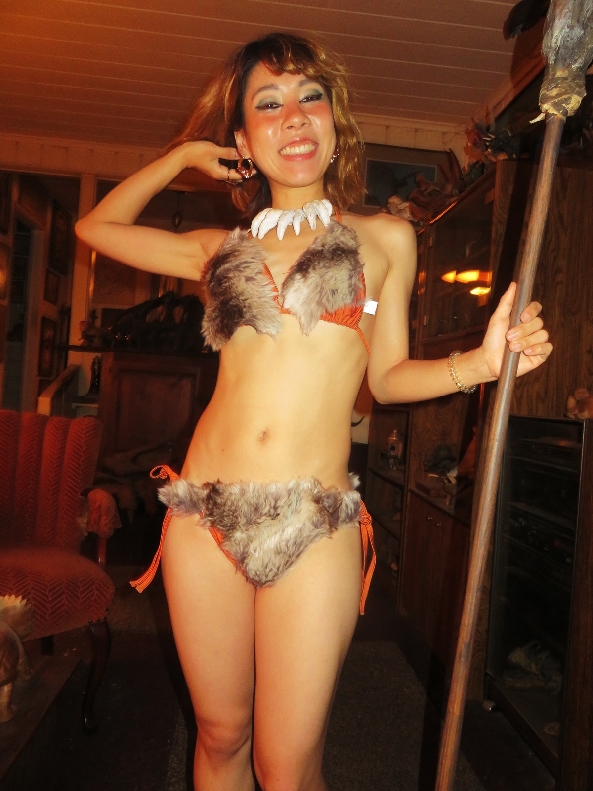 These are costume-test photos I shot of dancer-model-actress Mu Wang for two music videos, Mu-Seum and Danse Prehistorique — starring, choreographed and edited by Mu, directed and videographed by me — filmed inside my museum-house and in the backyard,