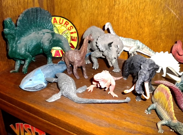 Atop and within the lawyer’s cabinet, some of many resin and vinyl assembly kit models from the Kaiyodo company, Kyoto, Japan.