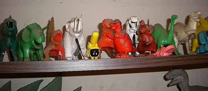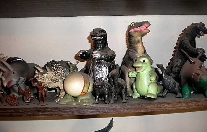 Just some of the many (space-conserving) shelves displaying miscellaneous dinosaur toys (including some Godzillas) — way too many and too hight up for dusting.