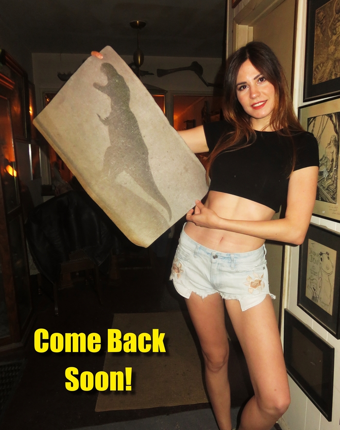 To go directly to Gallery 1, CLICK HERE or on the photo below of one of our many cordial Museum Tour Guides. She and the others on the Tour Guide team will lead you through my museum home and prehistoric collection. To go directly to my “Dinosaur Park,” CLICK HERE or on the appropriate photo below of another of my guides. Visitors — who are at least 18 years old – may also want to check out “Gallery 2.” There’s a whole “tribe of cavegirls” outside waiting to meet you. But watch out for those spears! For Gallery 2, CLICK HERE or on the appropriate photo below.