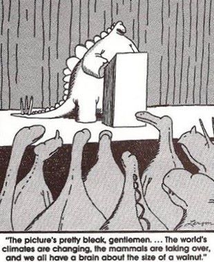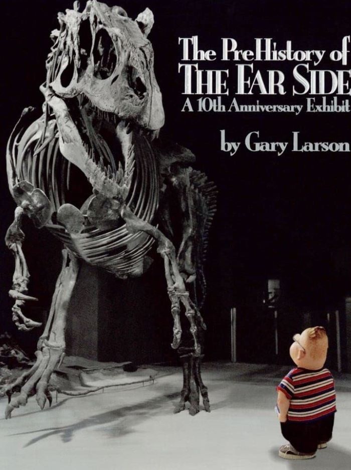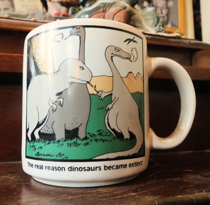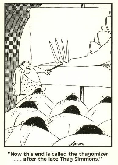 The Far Side is a single-panel comic strip created by Gary Larson that often features prehistoric themes including dinosaurs and, more often, Neanderthals in their versions of modern situations.  Larson’s cartoon depicting dinosaurs smoking cigarettes has become a classic and has been featured on greeting cards, shirts, coffee mugs and many other items. It can still be seen attached to bulletin boards in museums and paleontologists’ offices. And some paleontologists now informally to the tail spikes on a Stegosaurus as a “thagamizer.”